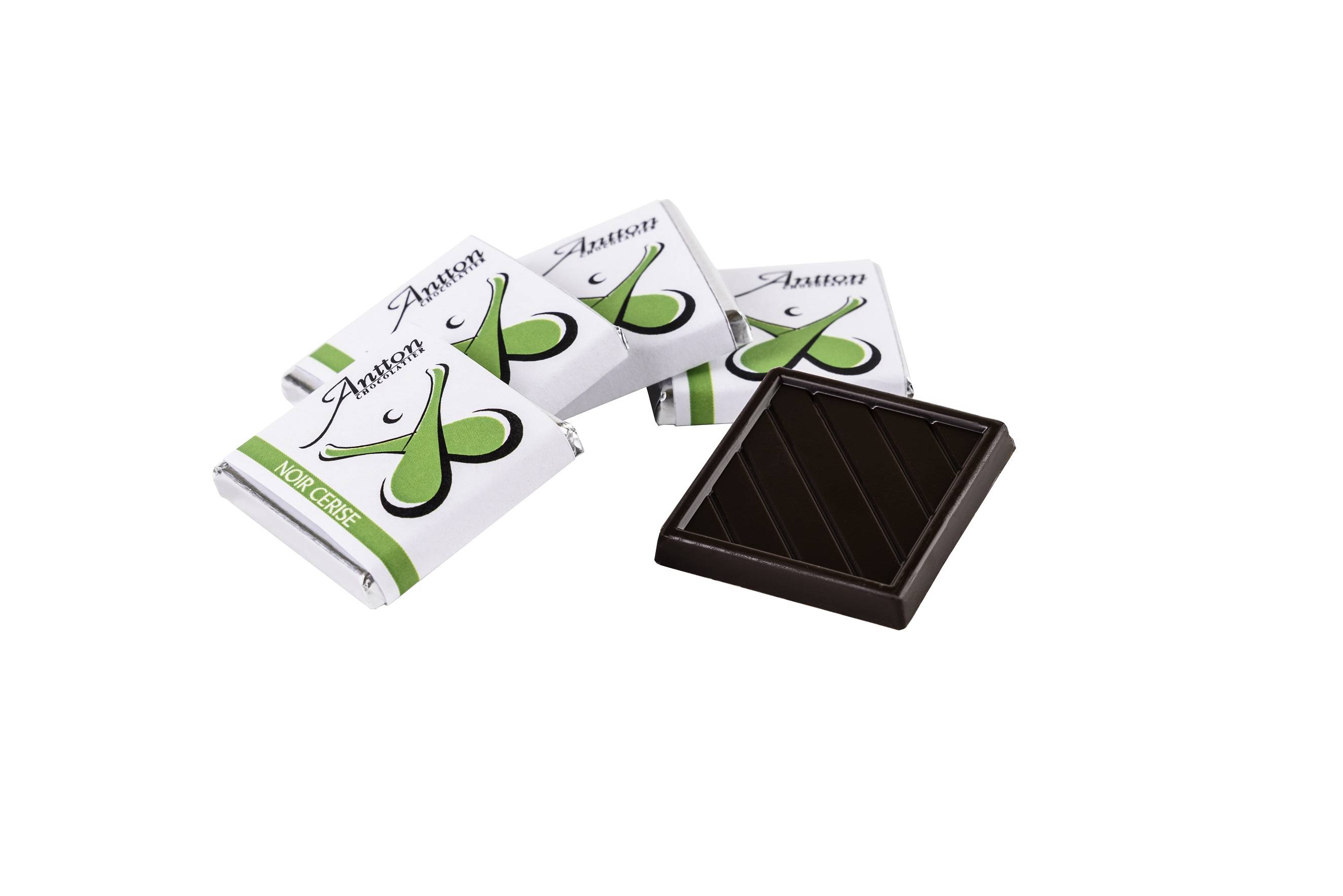 Mini tablette de 5g de chocolat Noir 58% de cacao parfumé à la cerise. Petit délice à déguster à l'heure du café !