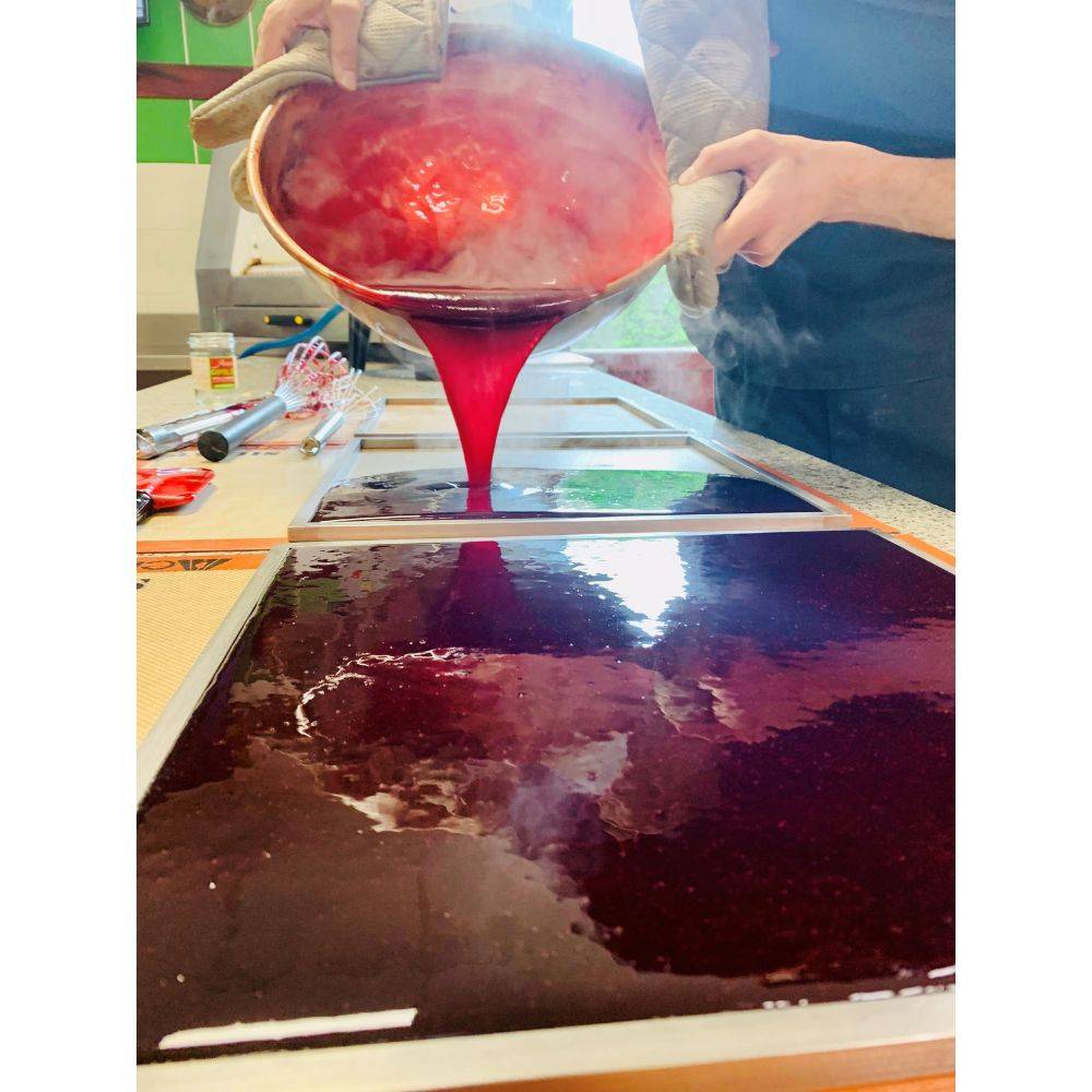 Quand la préparation a bien épaissi, il faut laisser le temps au temps, les chocolatiers étalent la pâte dans un cadre. Et après refroidissement, il conviendra de découper la pâte en carrés. Quand ils ont bien séché, ces carrés de pâtes de fruits sont enrobés de sucre. Et le tour est joué !